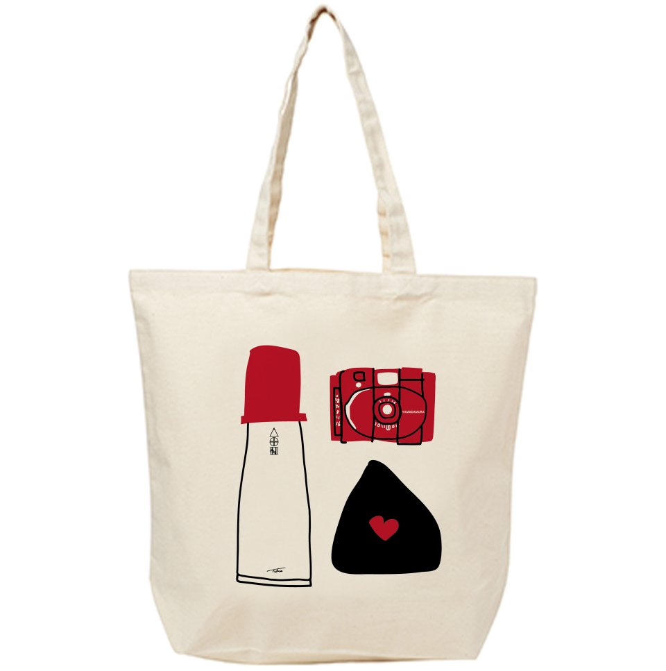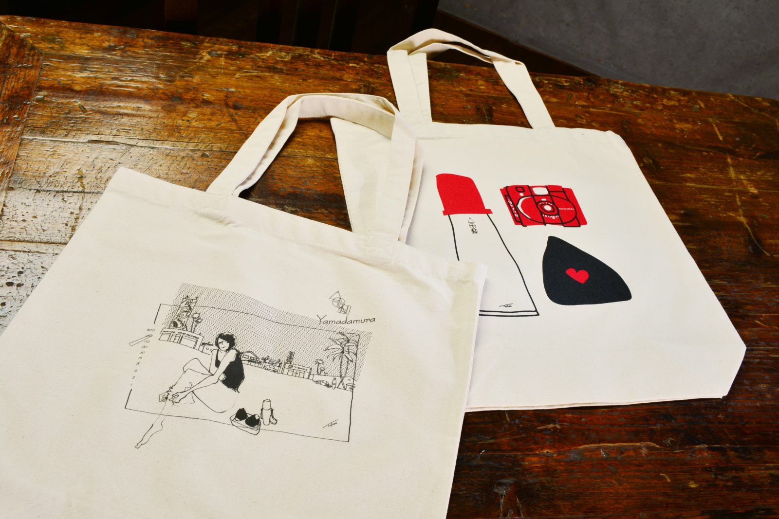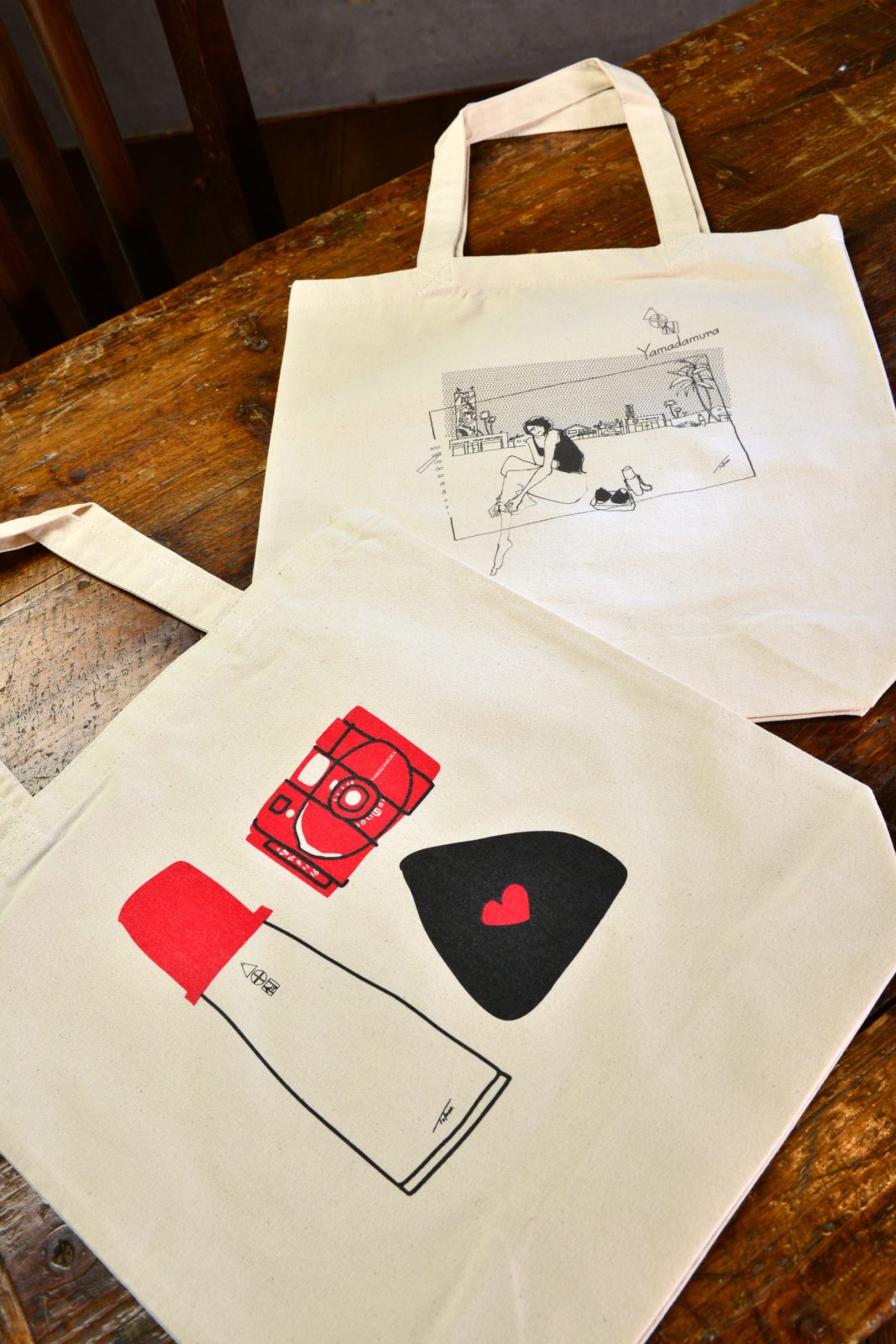 オリジナルエコバッグ。細かい面はインクジェット、裏面はシルクスクリーンのイラストに合わせた両面仕上げ。戸倉弘一朗氏による書下ろしです。 柔らかく耐久性抜群の使いやすいトートバッグです。 W36cm×H37cm×D11cm 内容量10ℓ 綿100%(キャンパス)